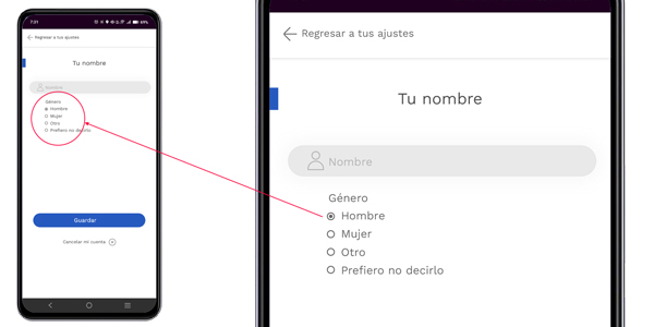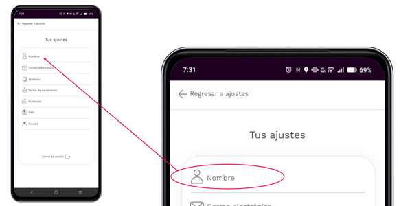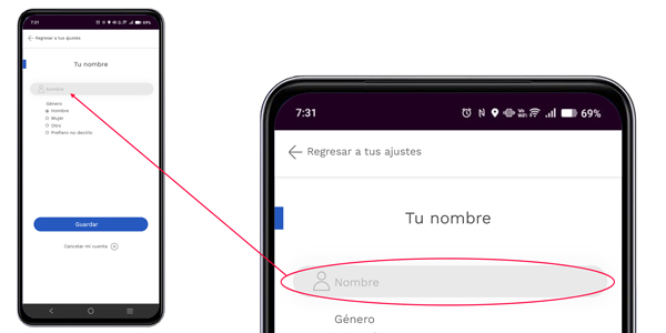 Para acceder a tu nombre de usuario solo debes dar clic sobre el campo nombre para entrar a la opción, a continuación puedes cambiar el nombre de usuario.